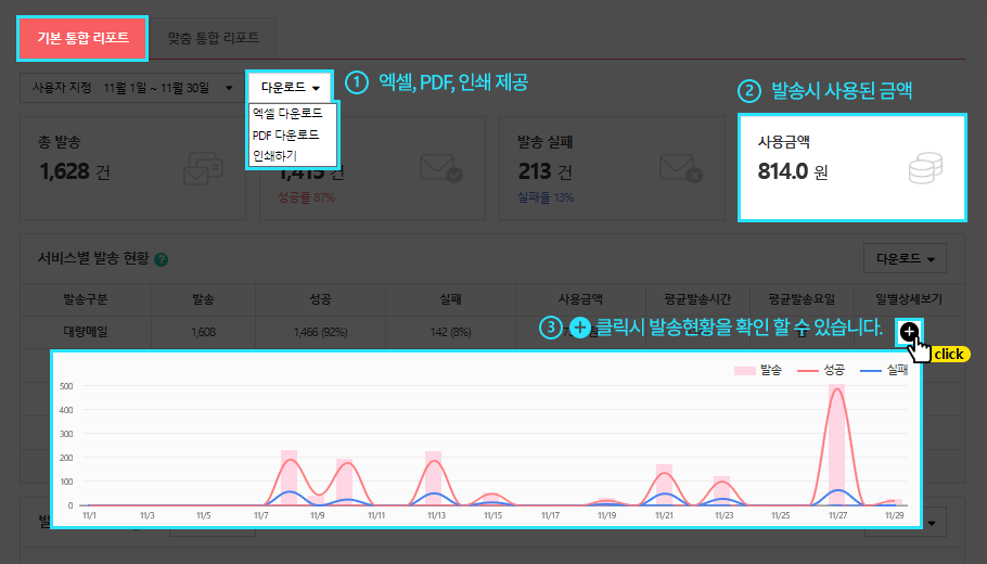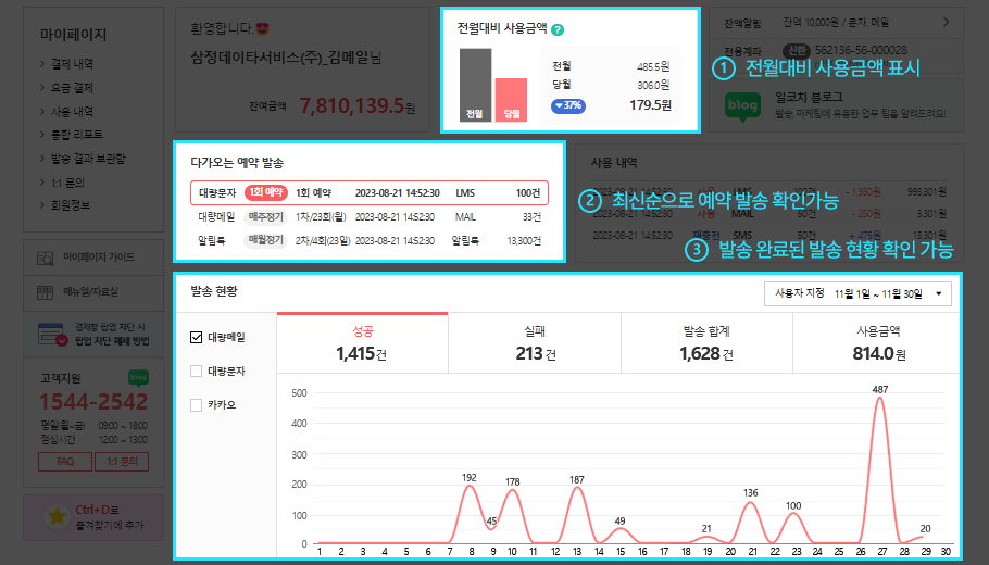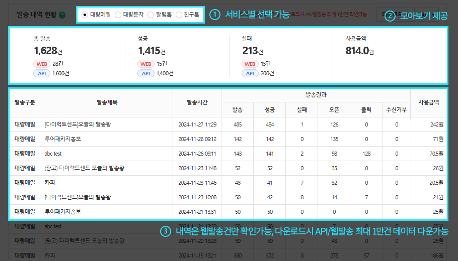 ※ 메일발송 시 전체 발송대상자에 대한 비용은 선차감 되며, 발송실패 및 취소 건은 환불됩니다.