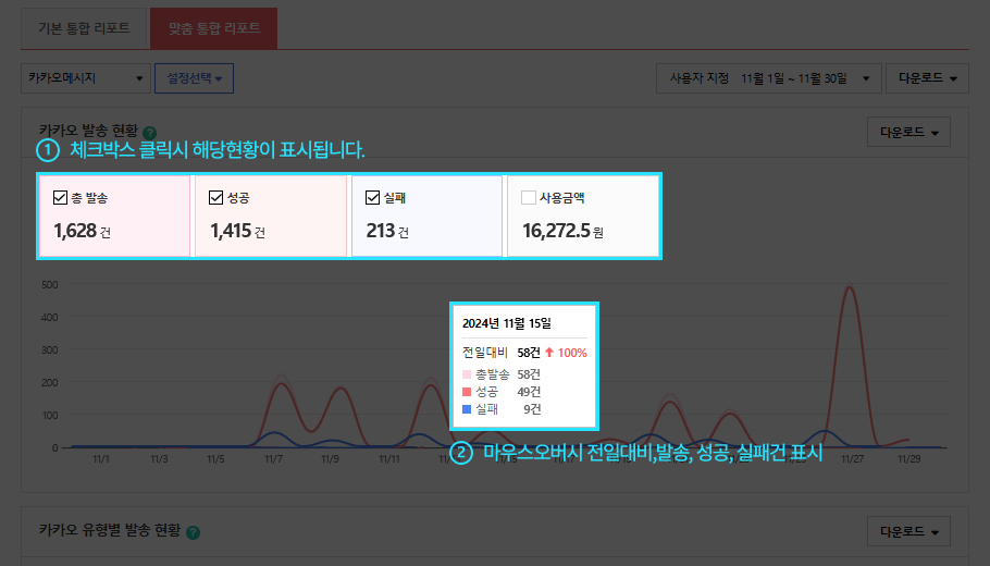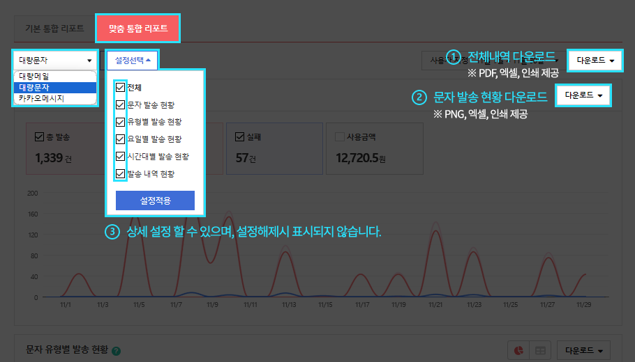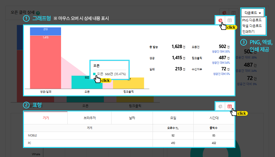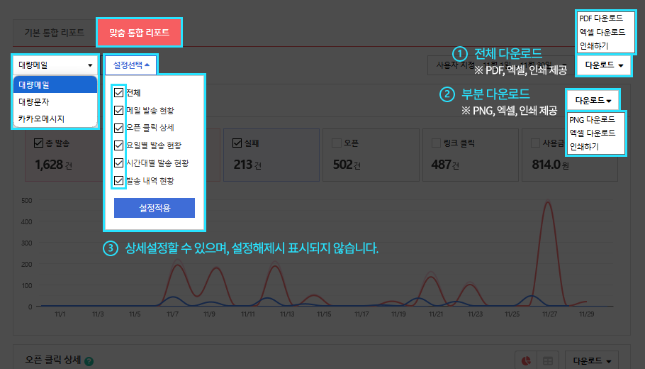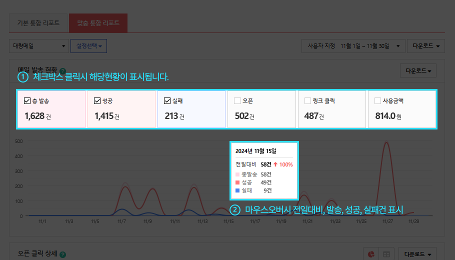 - 결과 보기를 클릭하면 결과리포트를 확인할 수 있습니다. 결과리포트는 전체 발송그룹의 데이터를 통합하여 1개로 제공되며, 발송 완료된 그룹의 데이터만 제공합니다.