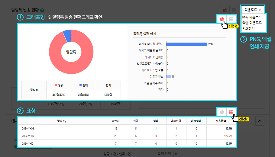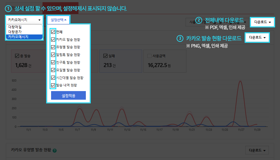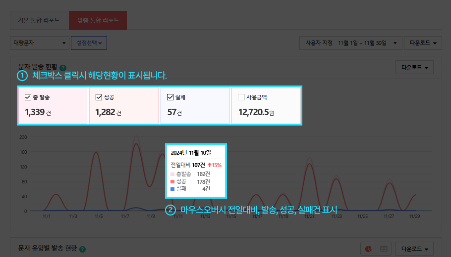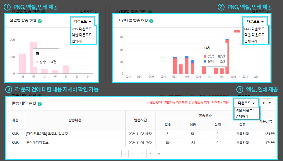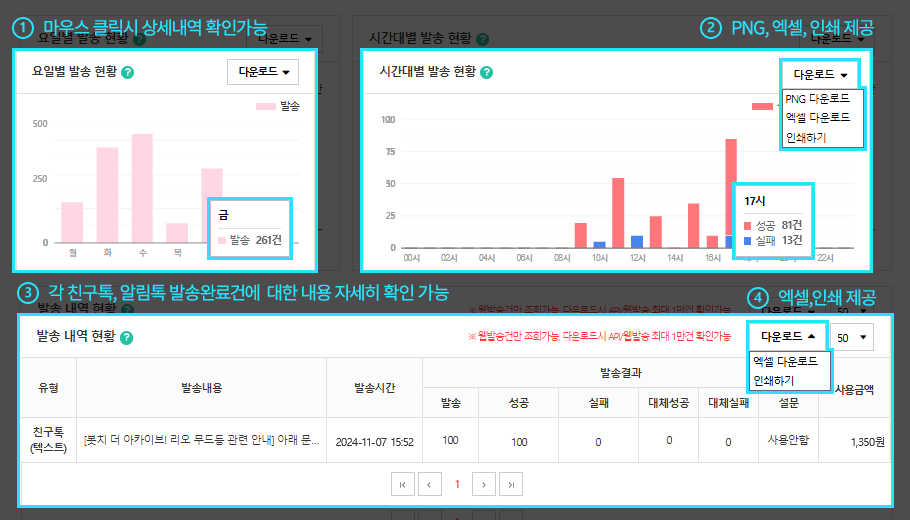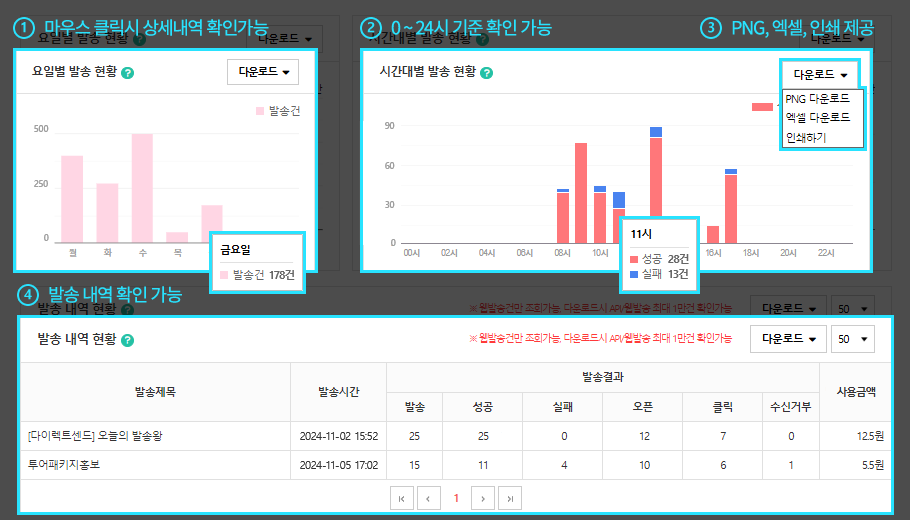 그룹별로 발송내역이 표시되며 각각의 A/B 테스트는 라인으로 구분됩니다. 발송내역은 최대 1년까지 조회할 수 있으며 이전 데이터는 자동 삭제됩니다.