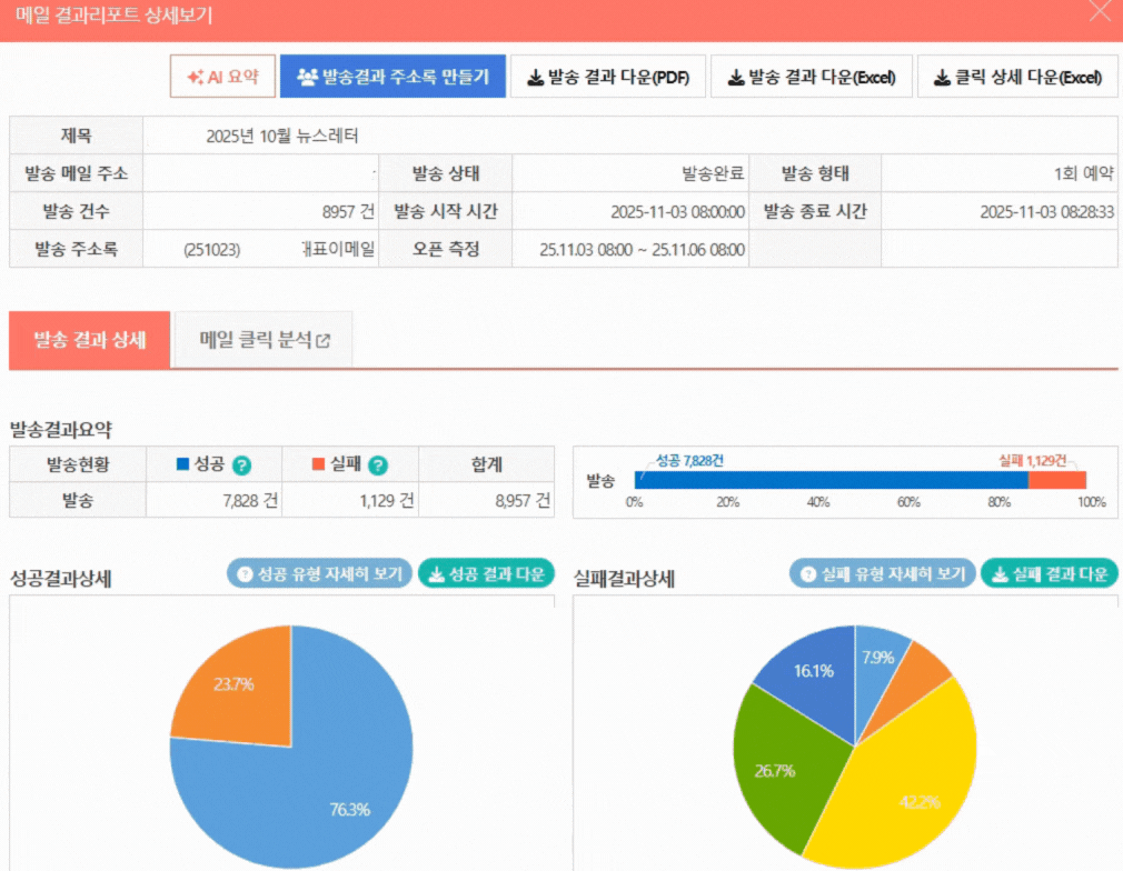 이제 발송 완료된 결과 리포트에서 AI요약 버튼 하나로 AI가 분석한 결과를 확인하실 수 있습니다.